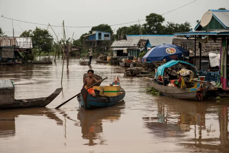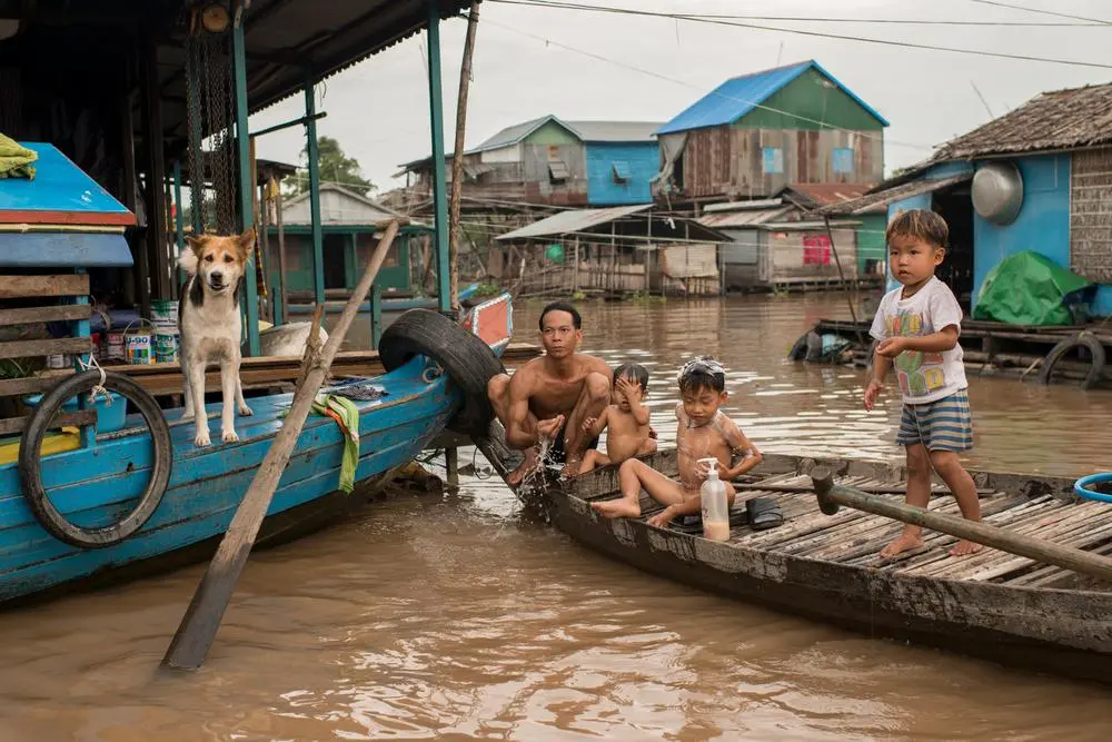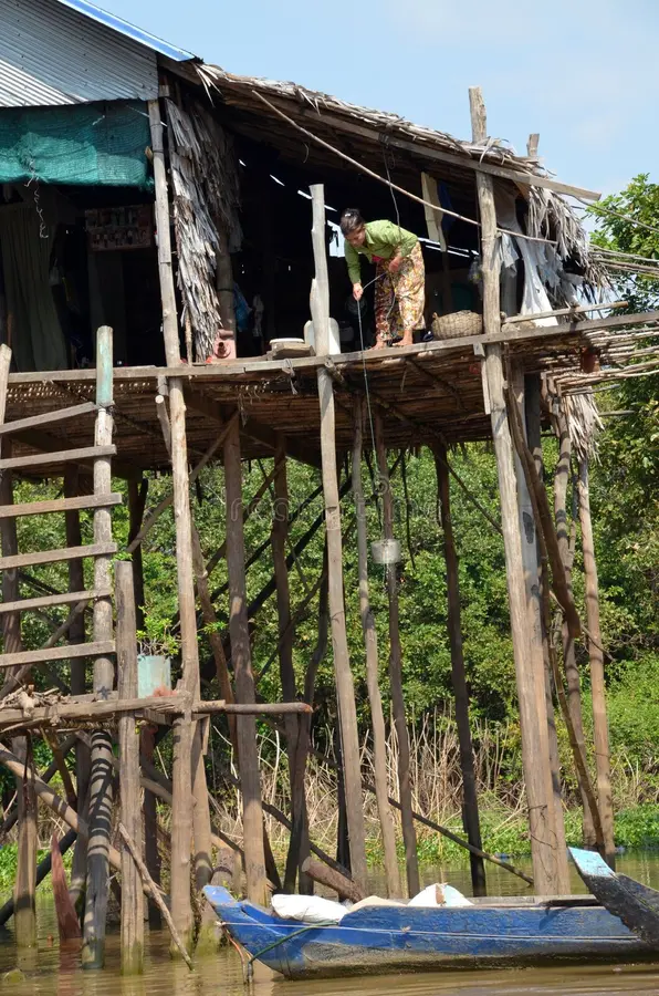 I den tørre årstiden ser disse hjemmene ut til å henge høyt over den sprukne jorden. Men når monsunen kommer, svulmer innsjøen – noen ganger seks til ti ganger sin størrelse – og oversvømmer hele området. Da begynner magien. Husene på bambuspåler kan plutselig bare nås med båt, og hele liv leves på vannet – skoler, kirker, butikker og til og med grisebinger gynger med bølgene. Noen hjem er bygget på flåter og flyter opp og ned med vannstanden.