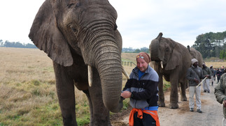 Før frokost var jeg med på en morgentur med fem av elefantene som bor i denne parken. Jeg skulle gå med Thato (uttales "tha-toe"), den yngste av elefantene her som var 17år. Hun kom til parken etter atbegge foreldrene ble drept på en jaktgård og myndighetene tok over ansvaret for babyelefanten. De første årene ble hun oppbrakt på flaskemelk men lærte seg etterhvert å ta kontroll over flasken selv.